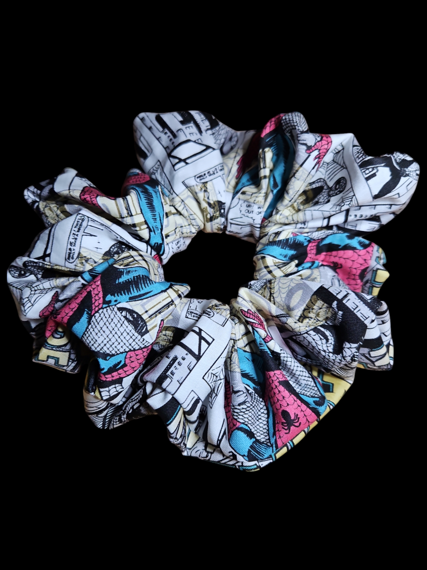 Large Spiderman in Comics Scrunchie with plumeria prints. 7' wide and 40'